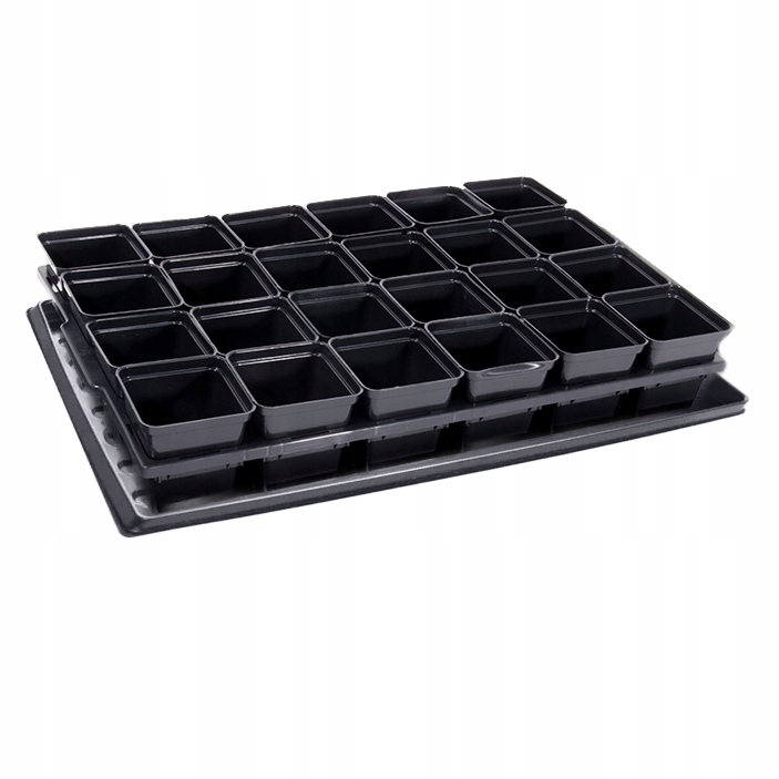 Zestaw doniczek produkcyjnych P9 z podstawką to kompletny wybór dla profesjonalistów i hobbystów. W zestawie znajduje się 24 doniczki o wymiarach 9x9x9,6 cm (0,5 l) oraz solidna tacka transportowa z 24 przegródkami i podstawka 60x40x5 cm, zapewniająca wygodę i porządek w uprawie roślin.