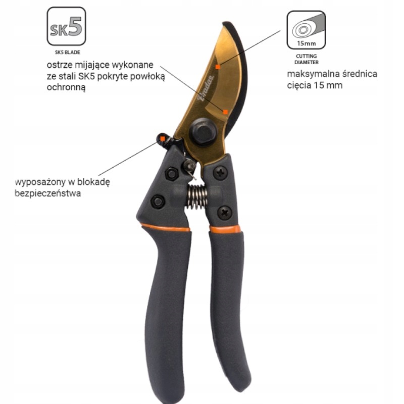 - Trwały mechanizm sprężynowy: Zapewnia płynną pracę i szybki powrót ostrzy do pozycji otwartej, co przyspiesza pracę w ogrodzie.