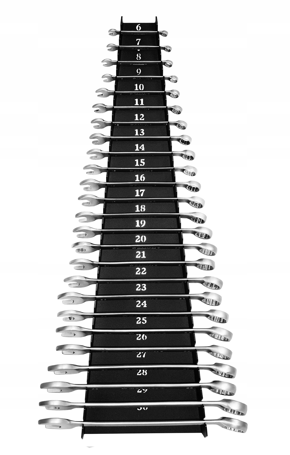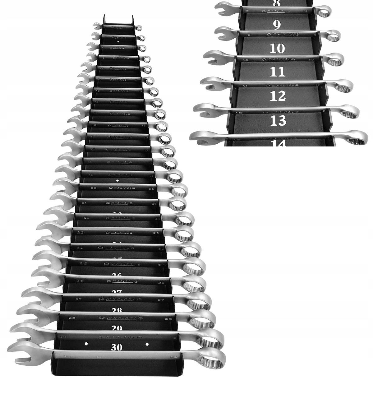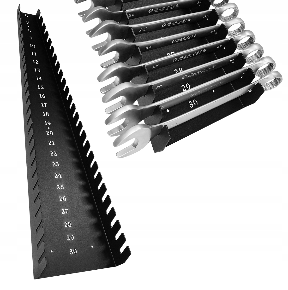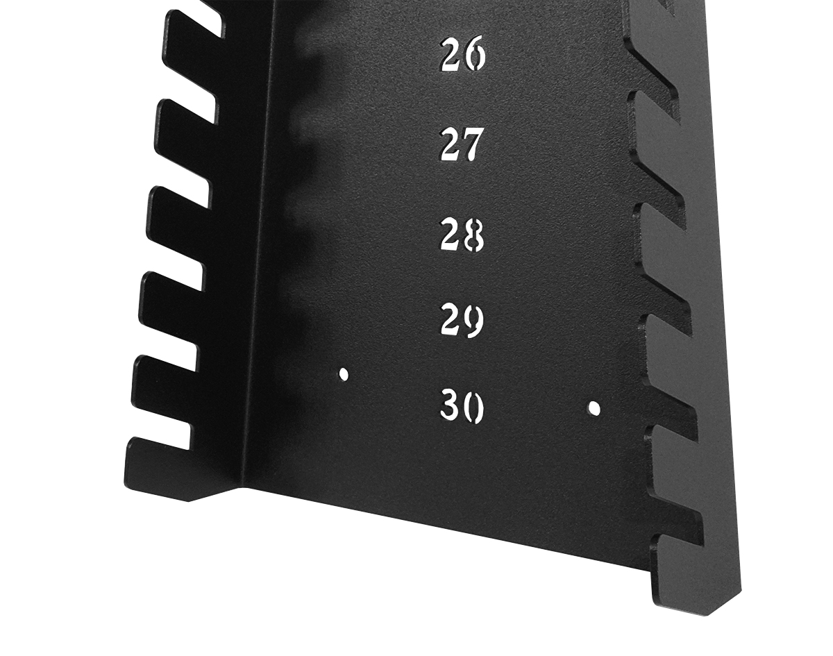 • Pojemność do 25 sztuk: Specjalnie zaprojektowana konstrukcja pozwala na zawieszenie pełnego zakresu rozmiarów kluczy płasko-oczkowych w jednym miejscu.